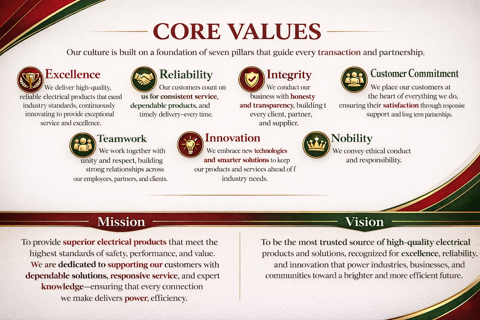 We are dedicated to powering progress through quality, innovation, and reliability. As a trusted supplier of electrical products and solutions, we serve a wide range of clients—from industries and businesses to local communities—helping them achieve safety, efficiency, and sustainability in every project.